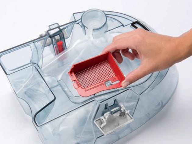 سلة سهلة التفريغ تساعد على التقاط الأوساخ قبل أن تصل الى خزان المياه المتسخة.